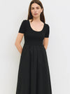 The Lynette Dress combines a form-fitting, scoop-neck knit top with a lightweight, full maxi skirt for a perfectly balanced silhouette. The shirring at the waistband and a convenient side zipper create a flattering fit that moves effortlessly. This versatile midi dress is a go-to piece for everyday wear, providing both comfort and elegance in one. Features: Knit top with a flattering scoop-neck Lightweight, full maxi skirt Shirring at the waist for a cinched fit Side zipper for easy wear Flattering and effortless silhouette