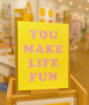 A vibrant "You Make Life Fun" card with bright pink text on a cheerful yellow background. This uplifting friendship card celebrates joy and positivity in a fun, colorful way.